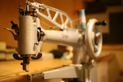 靴用のミシンは以前(靴の)修理会社にいた時にもずっと使ってたけど、あまりカッコいいものではなかった。だから自分の店に置く時にはボク的にカッコいいなぁって思うミシンを置きたかったわけ。(傍から見たら、ミシンにカッコいいも悪いもないんだろうけど。)修理用のミシンは機能といったら直線縫いオンリーなので、どこのメーカーでも機能的には特に大きな差はない。だからデザインの納得いくものが欲しかった。やっと見つかったのは、中古(はるばるドイツより)。新品にはないカッコよさがあった。気がついたら、閉店した後1時間ぐらいボ~ッとミシンを眺めてた。